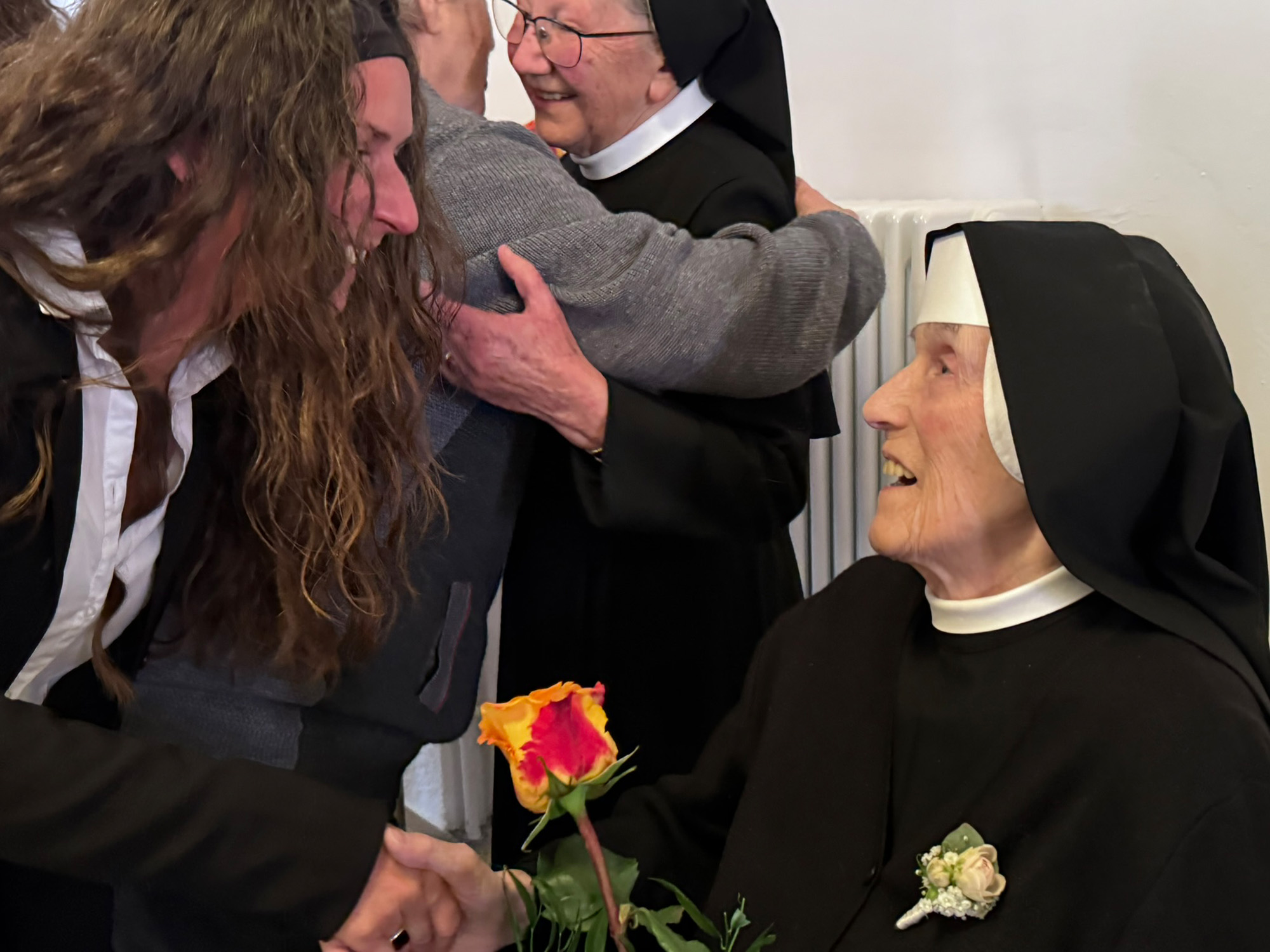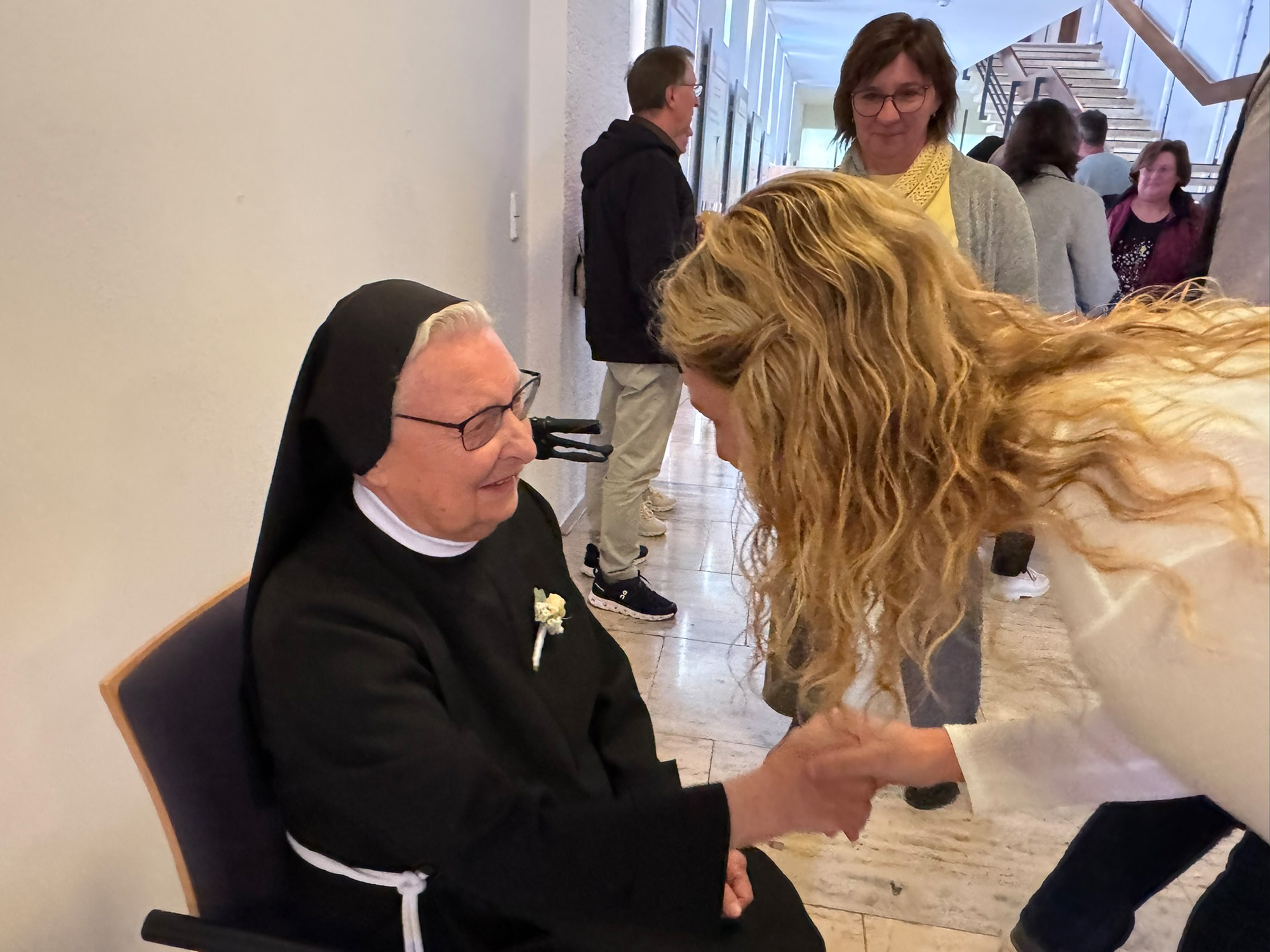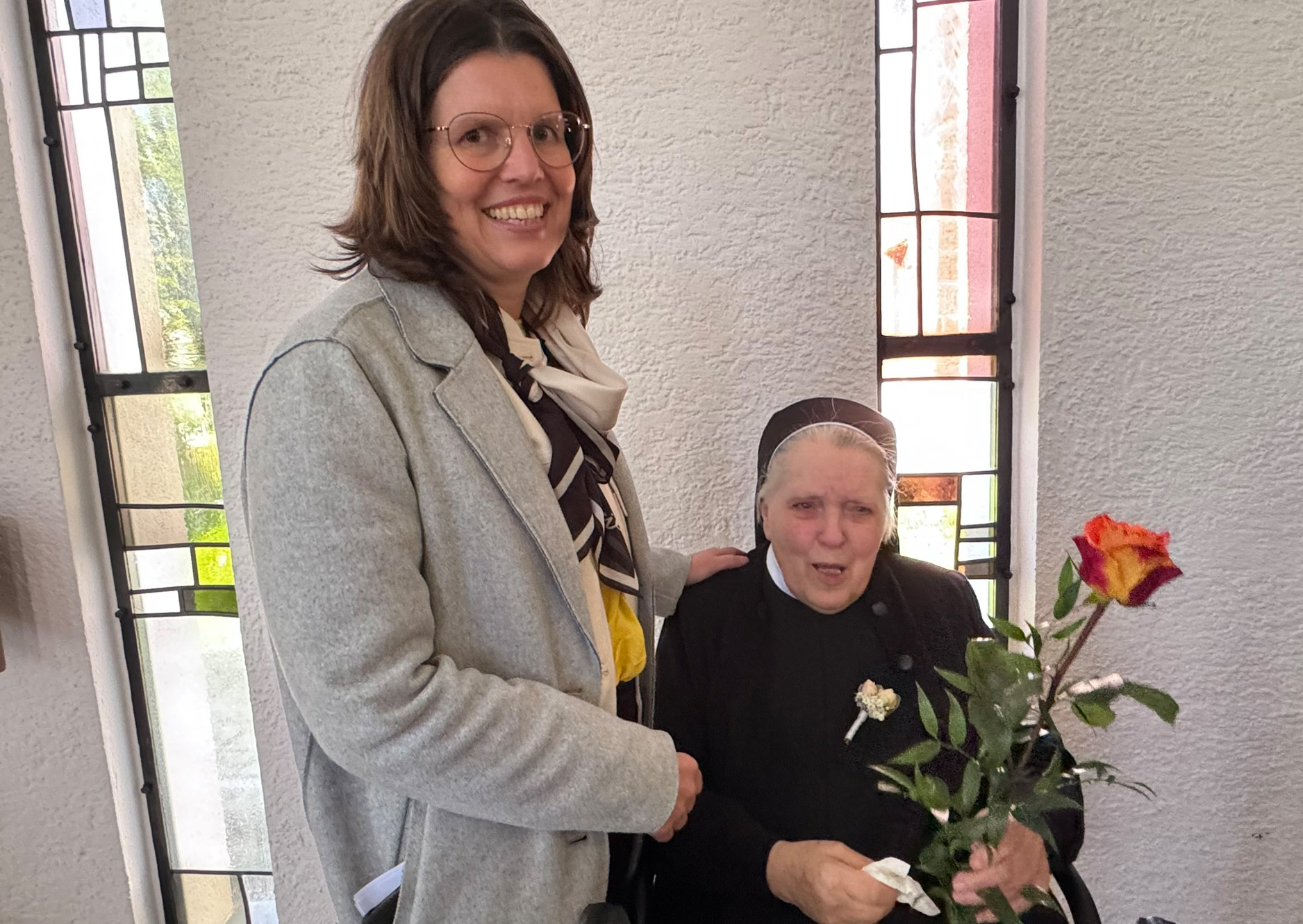 An Sr. M. Johannella gewandt sagte sie: Du, liebe Sr. Johannella, feierst 65 Jahre Treue Gottes in Deinem Leben. Zwei Orte haben Dich vor allem geprägt – Deine Zeit und Arbeit in der Bürstenwerkstatt und Deine Zeit in Baindt. Dir lagen und liegen die Menschen am Herzen, mit denen Du unterwegs bist.